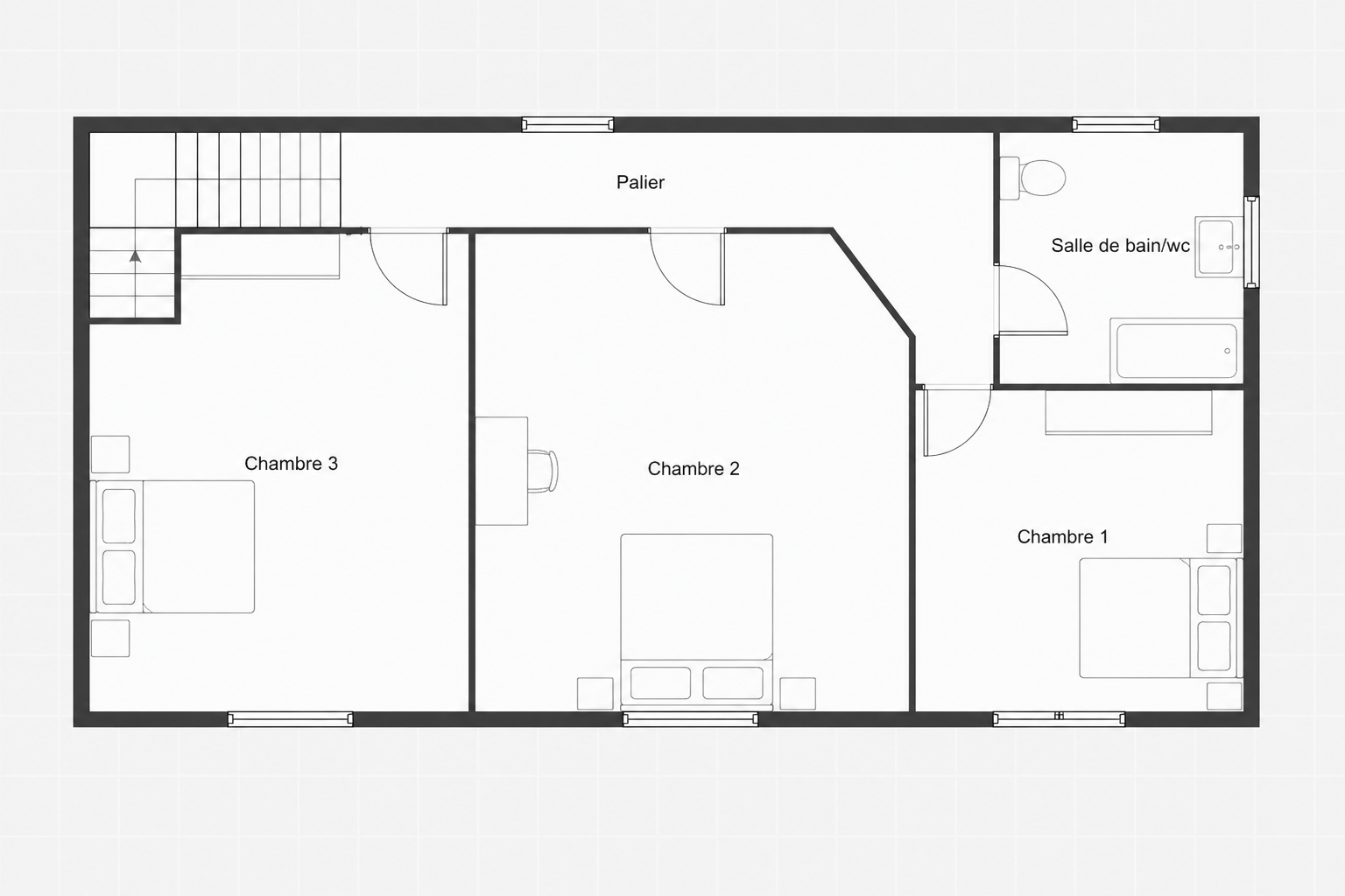 L’étage se compose de trois chambres lumineuses et d’une salle de bain équipée d’une douche et d’un WC, offrant un espace nuit confortable pour une famille.
